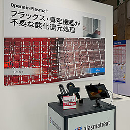 本展示では、従来の酸化膜除去に用いられていたフラックスやギ酸に代わる新たな表面処理技術として、大気圧下での酸化還元処理もご紹介しました。これは、Openair-Plasma®を用いて窒素・水素混合ガスをプラズマ化し、酸化銅などの表面酸化膜を還元するとともに、金属表面を活性化させる技術です。一般的な水素還元処理とは異なり、低濃度の水素を使用しているため取り扱いが容易になり、安全性にも優れているプロセスです。